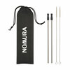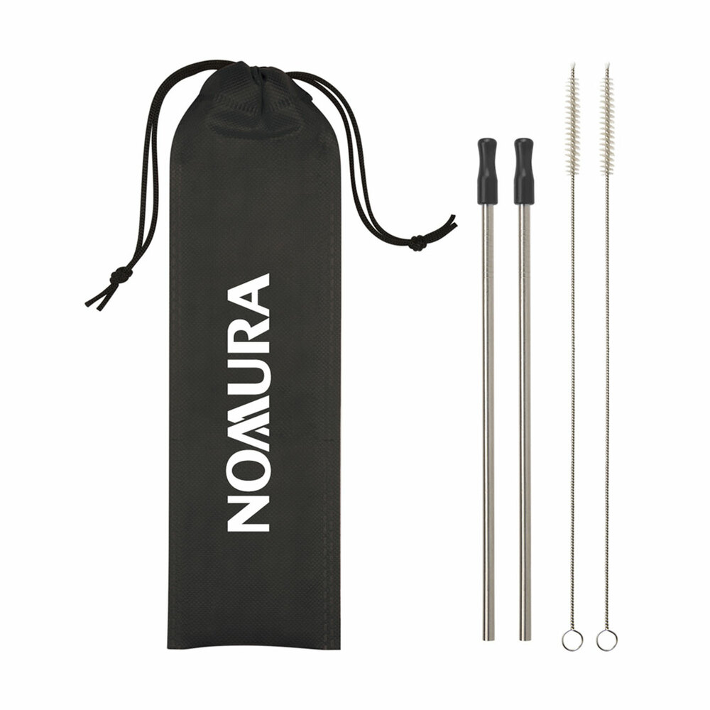 Set includes two stainless steel straws, two silicone tips and non-woven travel pouch. Reusable. Includes two wire cleaning brushes. Hand wash recommended. Features the Nomura logo printed in white. 11" W x 3 1/8" H.